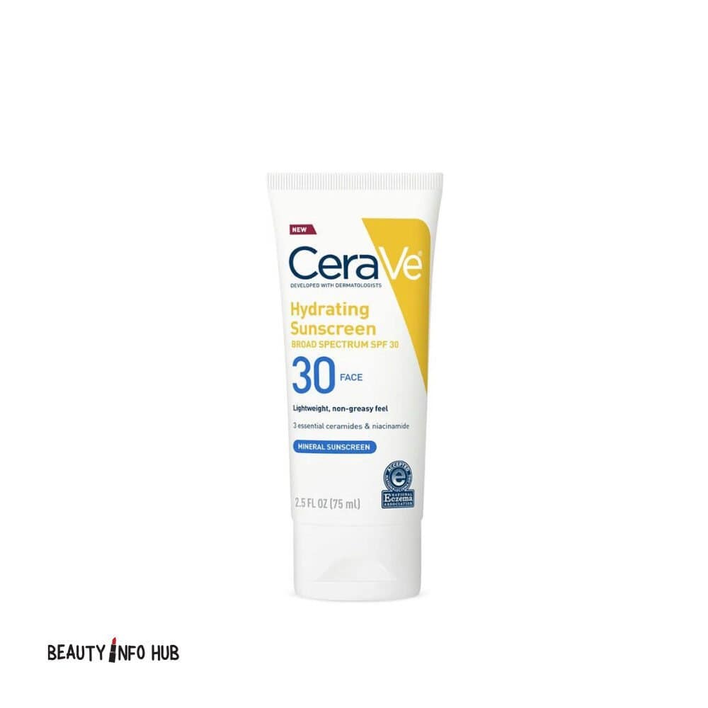 CeraVe Hydrating Mineral Sunscreen SPF30 provides broad-spectrum UVA/UVB protection using mineral-based filters (titanium dioxide and zinc oxide). Infused with ceramides, niacinamide, and hyaluronic acid, it hydrates, soothes, and supports the skin barrier, ideal for normal to dry and sensitive skin.