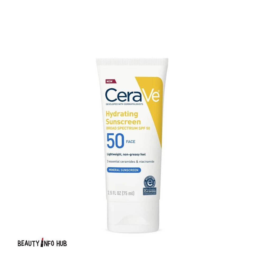 CeraVe Hydrating Mineral Sunscreen SPF50 provides broad-spectrum UVA/UVB protection using mineral-based filters (titanium dioxide and zinc oxide). Infused with ceramides, niacinamide, and hyaluronic acid, it hydrates, soothes, and supports the skin barrier, ideal for normal to dry and sensitive skin.