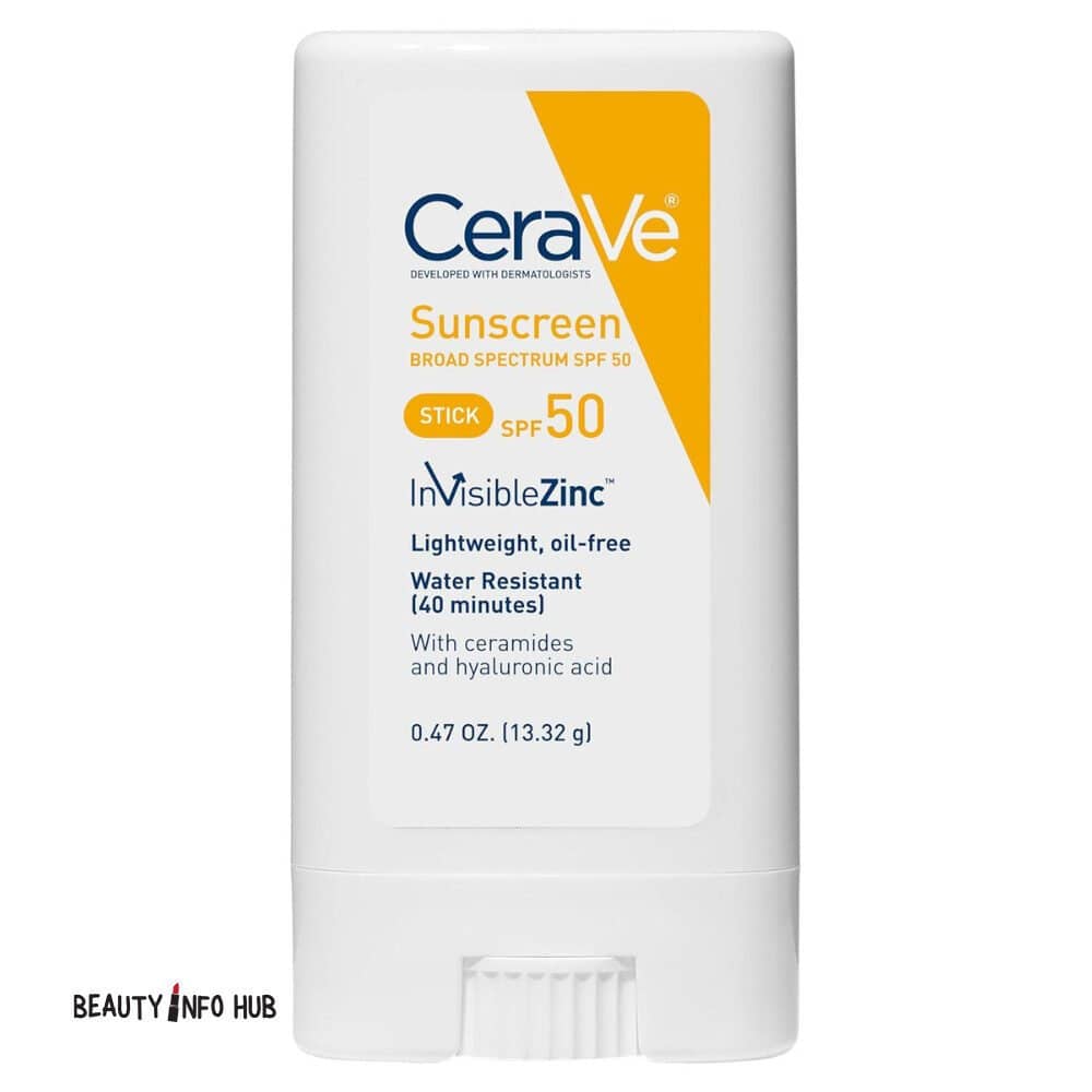 Apply CeraVe SPF50 Sunscreen Broad Spectrum Stick generously to clean, dry skin 15 minutes before sun exposure. Glide the stick directly onto face and exposed areas, avoiding the eye area. Blend with fingertips if needed. Reapply every 2 hours, or after swimming, sweating, or towel drying.