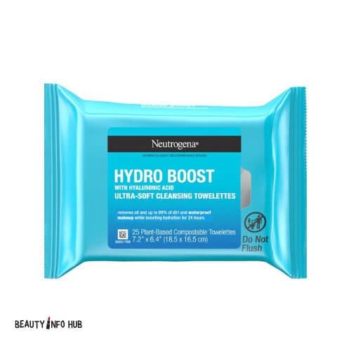 Gently wipe Neutrogena Hydro Boost Cleanser Facial Wipes over face and neck to remove makeup, dirt, and impurities, no rinsing required. Use one wipe per cleansing session, morning or evening. Dispose of used wipes properly and reseal the pack to maintain moisture.
