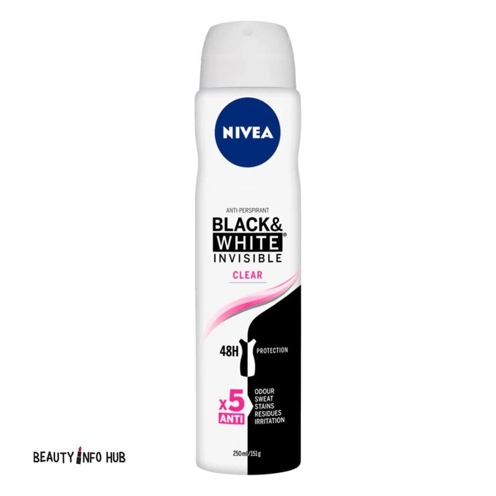 Nivea Black & White Clear Body Spray provides 48-hour protection against sweat and odor while preventing white marks on dark clothing and yellow stains on light clothing. Its advanced formula features a clean, clear scent, ideal for those seeking reliable deodorant protection with no visible residue.