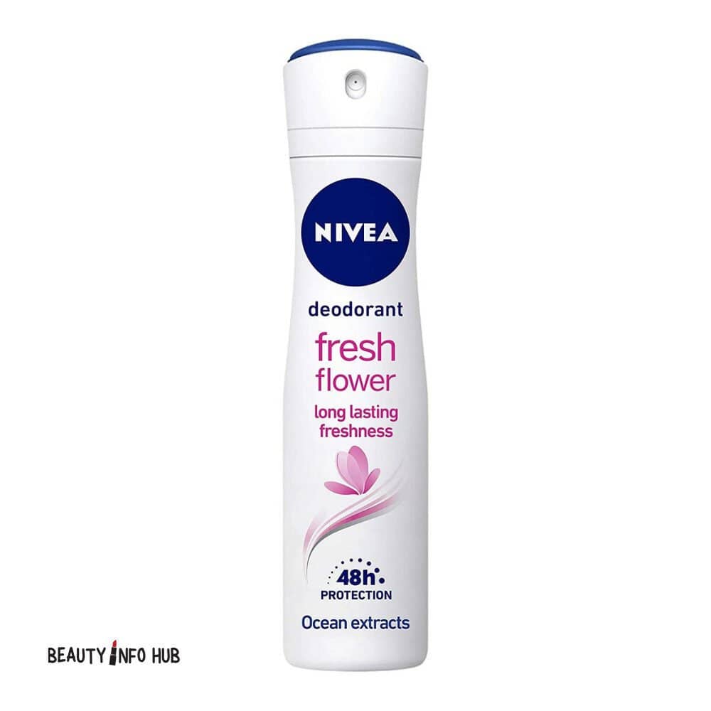 Nivea Fresh Flower 0% Deodorant Spray provides 24-hour odor protection with a delicate, floral scent, formulated without aluminum salts (0% aluminum). Its gentle, alcohol-free formula is designed to care for sensitive skin while delivering long-lasting freshness, ideal for those seeking a natural-feel deodorant.